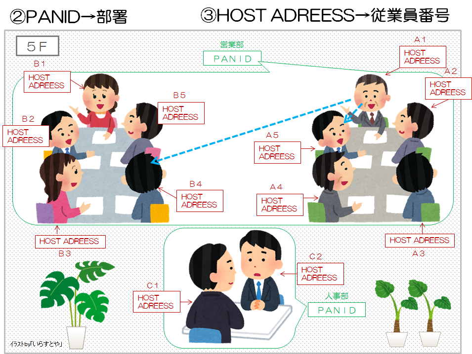 無線は、同じフロアー《CH》のフリースペースに色んな部署の人がたくさん入り混じっていても、どの部署《PANID》の誰《HOST ADRESS》を指定することで会話が成り立つ=「通信できる」、という事がわかりました!